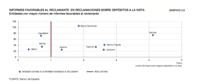 Bankinter es el banco que peor lo está haciendo. Presenta un mayor ratio de quejas e informes favorables al cliente sobre lo que debería ser su cuota de mercado. Le siguen Unicaja, CEISS, Ibercaja, Popular, Santander y Caixabank. En el lado contrario, los que mejor lo hacen en este caso son Bankia y BBVA.
