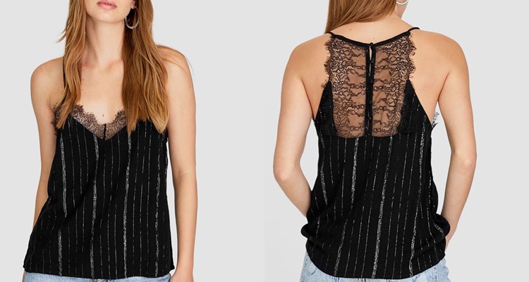 Los bordados de las prendas también te pueden hacer brillar, como este top lencero negro con hilo metalizado. Un diseño delicado que está decorado con encaje en la espalda para presumir de silueta.