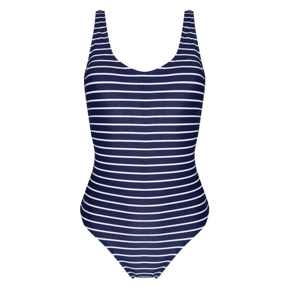 Los diseños en bañadores de rayas nunca pasarán de moda, y es que este estilo marinero es uno de los mejores para el verano. Aunque es muy sencillo, es también muy ponible, e incluso te puede servir para un look de diario. Basta con que le añadas unos pantalones vaqueros o unos blancos, y estás lista para salir a la calle.