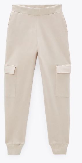 El siguiente pantalón es este pantalón jogger cargo de la compañía de Amancio Ortega, el cual está disponible en color verde claro y en color arena. Se trata de otro pantalón de tiro alto con cintura elástica, bolsillos laterales de plastrón y solapa en pernera.
