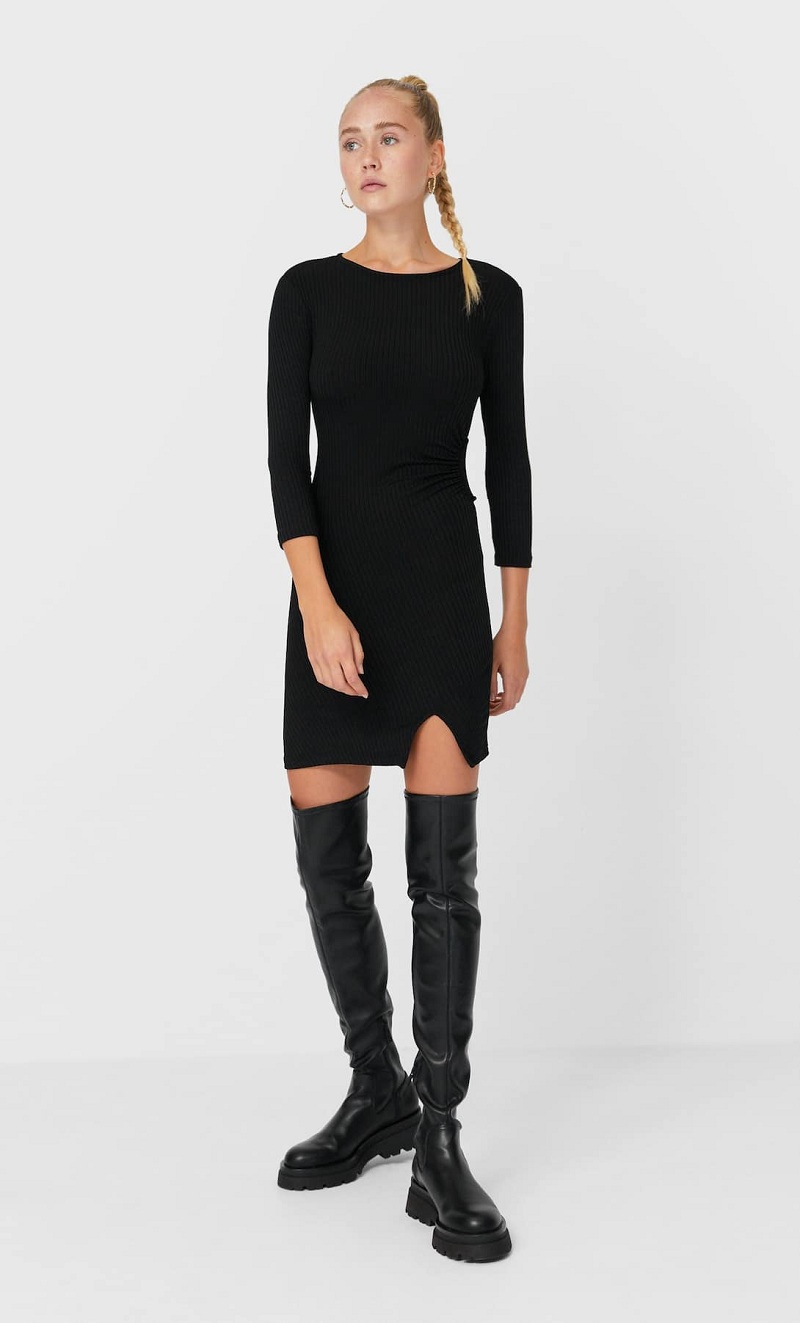 Este es un vestido ajustado al cuerpo con manga por debajo del codo y cuello redondo amplio. En el bajo tenemos detalle de apertura en un lateral. El precio de la prenda es de solo 5,99 euros, y este es el enlace donde puedes encontrarlo.