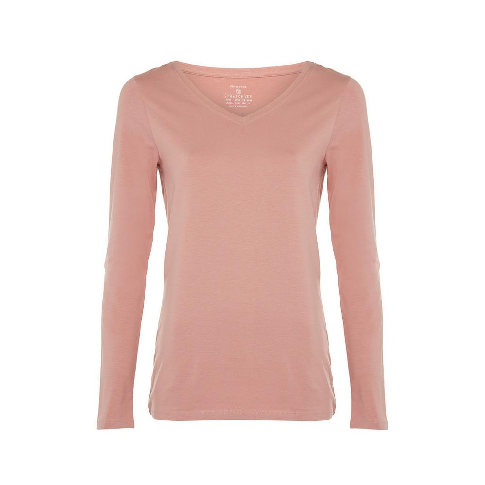 Finalizamos esta variedad de prendas básicas, que Primark trae para ti, con esta camiseta elástica de manga larga con cuello de pico rosa palo. Un modelo elegante para la dama de hoy, con sus mangas largas te permitirá proteger tus delicados brazos del sol del verano.