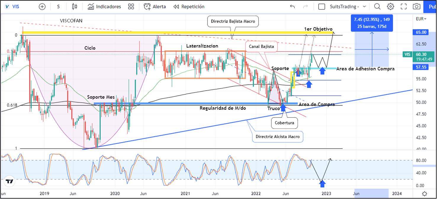 El precio puede continuar otras 3 semanas más en verde, de acuerdo a la ubicación del índice de fuerza relativa, estimamos un probable retroceso que, de visitar y respetar el soporte que dejó en 57,5 euros, nos daría oportunidad nuevamente para adherir posición en compra en busca de los 65 euros que establecemos como primer objetivo que corresponden al cierre del ciclo de toda la estructura y que representa más de un 13% a revalorización adicional.