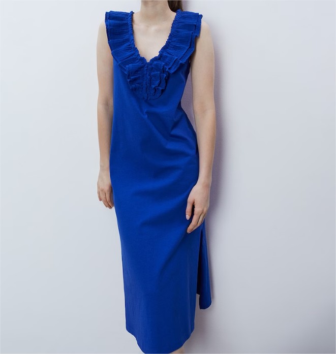 El siguiente vestido que hemos seleccionado es un diseño largo disponible en tres colores diferentes, permitiéndote elegir el que más se ajuste a tus preferencias y necesidades. El vestido presenta un escote en V con volantes y dos aberturas laterales en la parte inferior.
