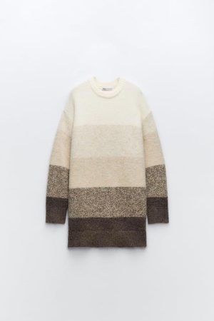- Vestido Zara: Franjas Neutras Este vestido de punto combina franjas de colores neutros como el marfil, beige y marrón. Con cuello redondo, manga larga y acabados en rib, es una opción versátil para combinar con leotardos calados y botas de montaña por 29,95 euros.
