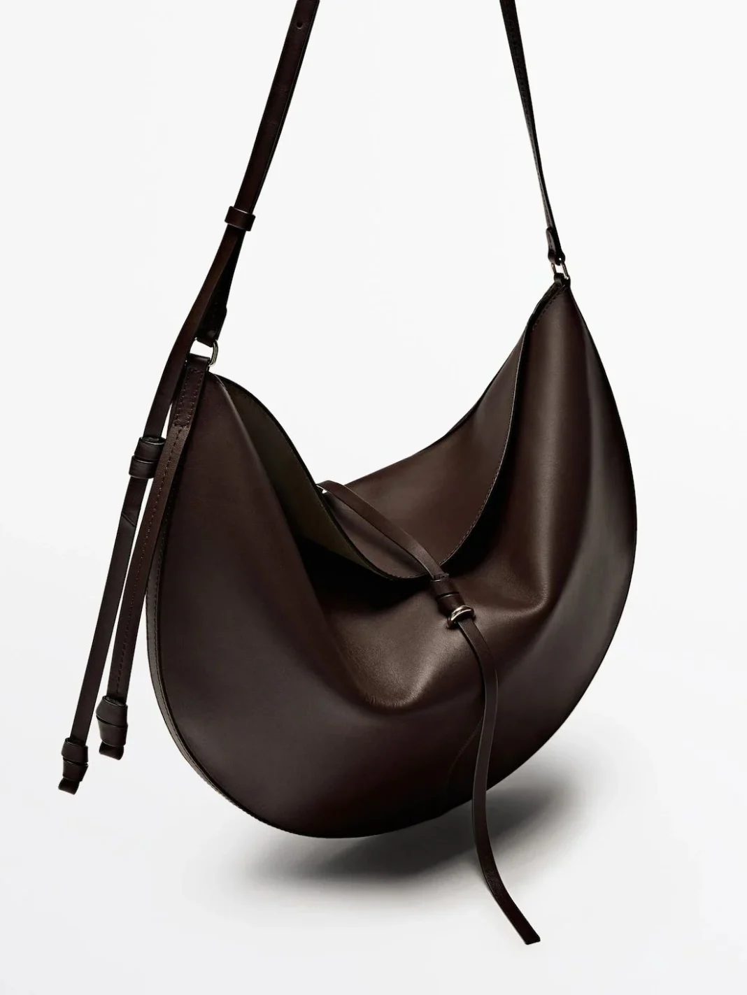 El bolso media luna de piel napa de Massimo Dutti es una opción ideal para quienes buscan elegancia y practicidad en un solo accesorio. Confeccionado en piel bovina de alta calidad y con un acabado en napa que le aporta suavidad y un toque de sofisticación, este bolso presenta un diseño contemporáneo con cierre de solapa con imán oculto.