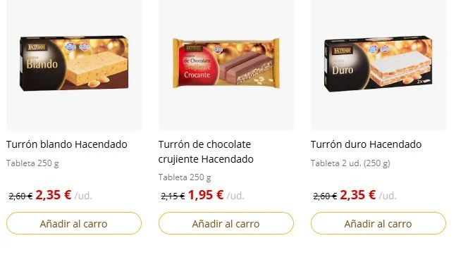Dia reinaría como el supermercado con los turrones de marca blanca más baratos, pero bien de cerca le sigue Mercadona y su marca blanca, Hacendado. La cadena de distribución liderada por Juan Roig tiene todos los turrones con precios por encima de los dos euros, pero ahora mismo cuenta con descuentos sabiendo que es una estrategia que capta la atención del cliente que ya está ultimando las compras de comida para las fiestas.