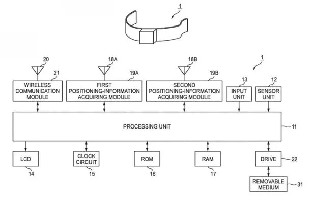Es cierto: llega tarde, muy tarde a las pulseras fitness, o a las inteligentes, pero está ahí o, al menos, por lo que se entiende de estos preliminares datos técnicos que os adelantamos en Merca2, va a estar. El dispositivo en sí hay que reconocer que no está muy claro qué sera. Parece que podría ser una pulsera independiente, pero también podría funcionar perfectamente como un complemento de un reloj, o incluso como complemento digital de un reloj analógico convencional (habida cuenta del conocidísimo proceso de pasos a analógico que en Casio están llevando a cabo). Pero lo que os podemos decir es que será un módulo capaz de transmitir una señal de nuestra ubicación, con información de lo más variopinta que pueda obtener del satélite (hora, coordenadas geográficas, altitud… y con tecnología que podrá trabajar en dos sistemas de satélite a la vez: en el GPS norteamericano, y en el GLONASS ruso. Un sistema de control (un «interruptor», lo llaman ellos) elegirá de entre los dos, mediante la capacidad que tendrá de decididir el estado de la recepción.