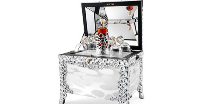 La bebida va dentro de una botella de cristal y la caja es abierta con una llave de bronce, que acciona un sistema que hace con que la botella se eleve automáticamente en una bandeja de veludo. Un trago de lo más exclusivo.