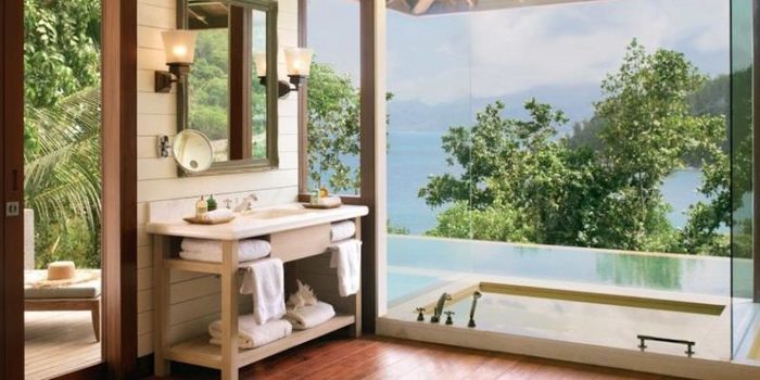 En el medio del Océano Índico, al suroeste de la costa de Mahé, se encuentra el espectacular Resort Four Seasons, en las Seychelles. Situado en la cima de una montaña, en las casas de árboles Serenity Villas, los viajeros pueden bañarse como si estuvieran al aire libre.