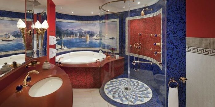 La Royal Suite cuenta con pilares dorados, una gran escalera, una biblioteca privada y un menú de 13 almohadas para garantizar que los huéspedes puedan descansar cómodamente. De los tres cuartos de baño en la suite, el más grande, de 108 m2, tiene una bañera con forma de rotonda en el centro, acabado en oro y mármol. Alrededor, los huéspedes pueden descansar en las zonas de sofás y elegir entre los productos y perfumes de Hermès.