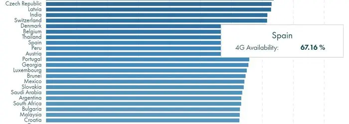 España, que además es líder europeo en despliegues de fibra óptica, tiene una cobertura 4G del 67,16%, lo que según este informe quiere decir que un usuario español de 4G tiene una posibilidad del 67,16% de tener cobertura móvil de alta velocidad en su terminal. Portugal tiene el 65,75%, Grecia el 59,79% e Italia el 54,16%.