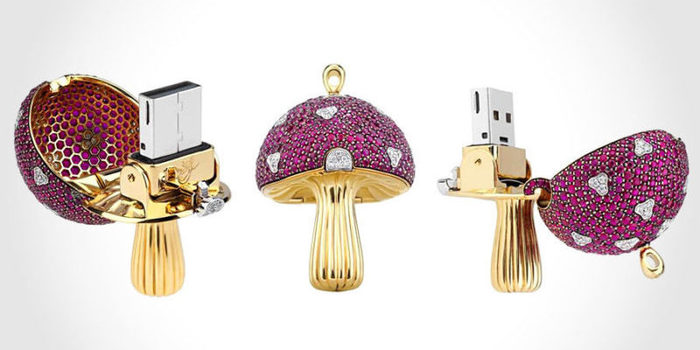No es muy común colgar un pen – drive al cuello, pero la joyería Shawish (una joyería suiza) ha desarrollado un dispositivo perfecto para disfrazar el artefacto. Con forma de un champiñón e idéntico a un colgante, el Magic Mushroom USB Key tiene cuerpo dorado y lleva varias piedras como diamantes, rubíes y zafiros rojos.