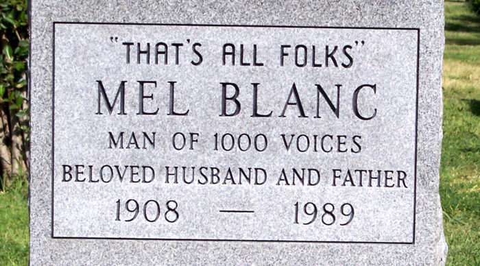 Uno de los epitafios que pueden recordarse con mayor cariño es el de Mel Blanc, que murió en el año 1989. Melvin llegó a doblar durante toda su carrera a más de 400 personajes de dibujos animados para Warner Bros y para Hannah-Barbera. Entre ellos, se encuentran Bugs Bunny, Pablo Marmol, el Pato Lucas o Porky.