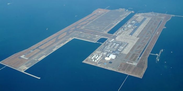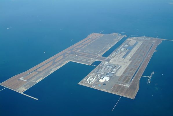 El aeropuerto internacional de Kansai está situado en una isla artificial en medio de la Bahía de Osaka en Japón. Diseñado por el arquitecto italiano Renzo Piano y abierto en 1994, el aeropuerto está situado en el centro y sirve como central para Japan Airlines, All Nippon Airways y Nippon Cargo Airlines. Ofrece vuelos desde y hacia 19 ciudades en 31 países con un tráfico total de pasajeros de poco más de 14 millones, de los cuales 11 millones son pasajeros internacionales.