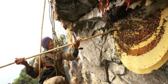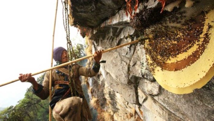 La miel del Himalaya se obtiene en las escarpadas montañas de esta cordillera y, para obtenerla, los apicultores se tienen que suspender de grandes cuerdas para llegar hasta unas colmenas que se ubican en los lugares más recónditos de las montañas. Por algo se les conoce como los cazadores de miel.