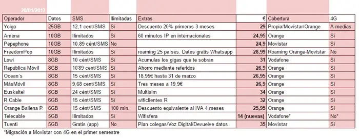 En todo caso, el año ha empezado bien para los abonados. Amena ha subido su franquicia de datos de 8 a 10Gb. Telecable, hasta que haga la migración a Movistar y empiece a ofrecer 4G, ha empezado con un descuento permanente del 50% a nuevas altas y cobra sólo 14€ por 5 Gb, que pasarán a ser en febrero 15€ por 6 Gb. Lowi, la filial low cost de Vodafone, también ha aumentado la franquicia, de 5 a 8Gb, ahora con llamadas ilimitadas.