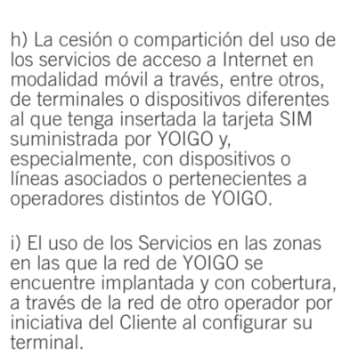 Sobre el papel, a partir de febrero Yoigo prohíbe el tethering a sus clientes, la posibilidad de conectar otros dispositivos a la red wifi creada por tu móvil. Asimismo, deja claro que habrá una «velocidad optimizada» para servicios multimedia en el móvil, de 480p. Asimismo, impide a los usuarios forzar la cobertura a otro de los operadores con los que Yoigo tiene acuerdos y evitar situaciones de mala señal.