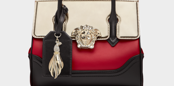 Versace ha creado una edición especial de su icónico bolso, el Empire Palace. El bolso está hecha de piel de becerro con un cierre de oro con la forma de una cabeza de medusa. La edición especial se compone de inserciones de diferentes colores (oro, rojo y negro) con una correa de negro y oro extraíble.