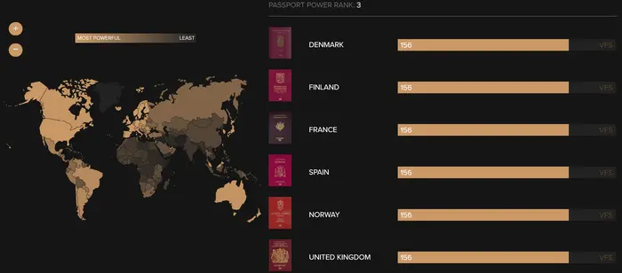 Aunque atendiendo a las categorías del índice ocupamos la tercera posición, compartida con Dinamarca, Finlandia, Francia, Noruega, Reino Unido y EEUU, en realidad ocupamos la séptima, ya que sólo estamos totalmente libres de visado en 121 países y necesitamos pedir un visado a la llegada en otros 35.