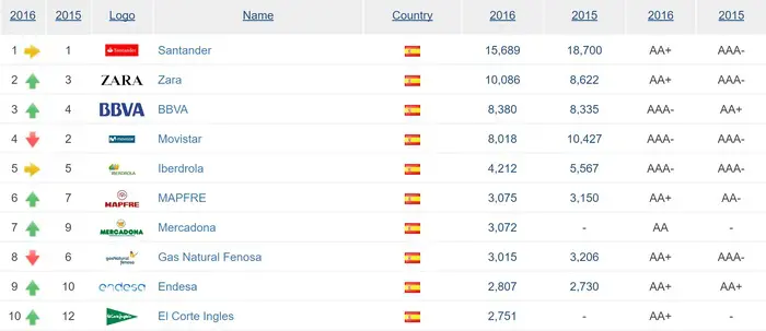 Santander sigue ocupando la primera posición en la misma, seguido de Zara, de Movistar y de BBVA. Sólo los dos primeros están entre las cien primeras posiciones del ranking global. Quien sí entra entre los 500 primeros es Repsol, que ocupa la sexta posición entre las empresas española.
