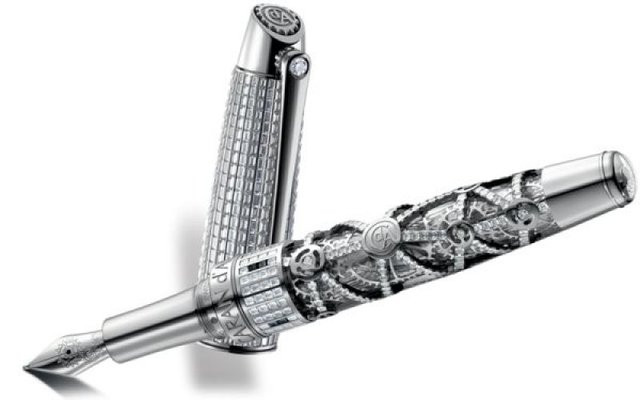 Está realizada, o salpicada, como dicen los expertos en este terreno, de unos 850 diamantes puros. El cuerpo de la pluma está hecho completamente a mano con oro blanco. Su precio, lógicamente, es de 1.200.000 euros, uno de los más altos que hemos visto hasta ahora.