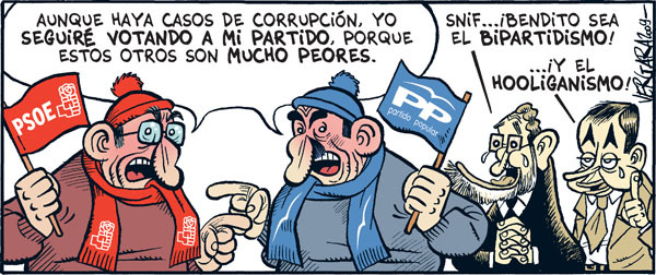 En fin, corrupción no es sólo meterle mano a la caja; corrupción es también dejar de lado los méritos de los aspirantes y promover un sistema de castas que permite que 50.000 personas manejen el cotarro generación tras generación. El “marianismo” no es ideológico, es simplemente funcional, y hará lo que haga falta para mantener el poder en manos de quienes lo detentan. Los cientos de miles de beneficiados que aplauden en esos congresos sin democracia ni transparencia que tanto le gustan al Sr. Rajoy, le necesitan para mantener sus puestos de trabajo y el futuro de sus hijos, y posiblemente de sus nietos.