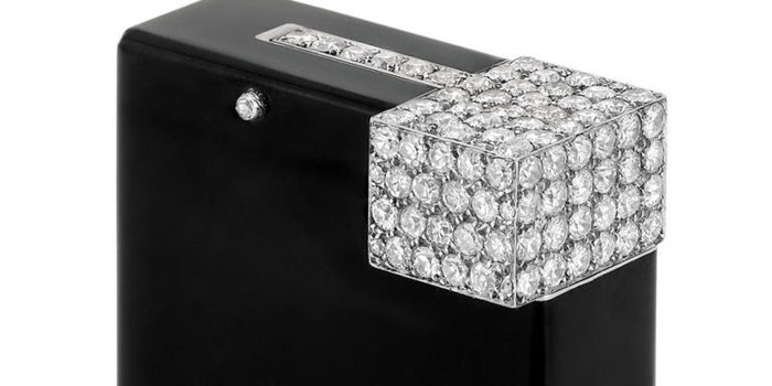 El exterior del mechero es negro esmaltado con una esquina superior que se adorna con diamantes. Los diamantes pesan 2,75 quilates en total. Esta pieza atemporal fue vendida por 34.375 en una subasta en Nueva York en al año 2013. Un mechero que todo el es sofisticación y que grita Cartier.