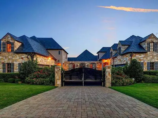 La mansión de estilo inglés en Fort Worth se encuentra en 1.56 hectáreas con una piscina de agua salada, un campo deportivo iluminado y un enorme jardin. La casa de dos pisos tiene salas de juegos, medios de entretenimiento, un salón con una chimenea, y un cine en casa dentro de su amplio espacio habitable. La cocina del chef está equipada con una isla en forma de L y se abre en un extremo a una gran sala con otra chimenea.