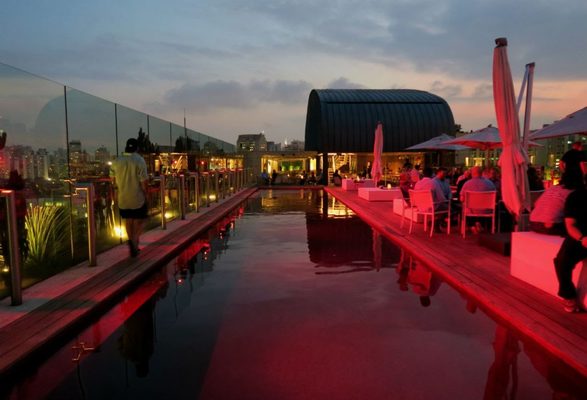 En un ambiente animado, este bar tiene una piscina de color rojizo y un salón fabuloso, con vistas panorámicas del Parque de Ibirapuera y todo el horizonte de São Paulo, incluyendo el horizonte de la avenida Paulista.