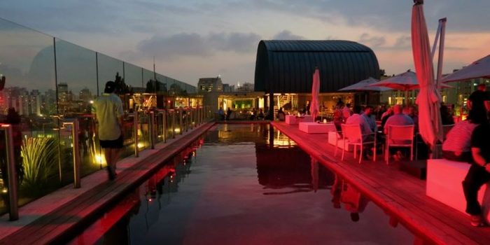 En un ambiente animado, este bar tiene una piscina de color rojizo y un salón fabuloso, con vistas panorámicas del Parque de Ibirapuera y todo el horizonte de São Paulo, incluyendo el horizonte de la avenida Paulista.