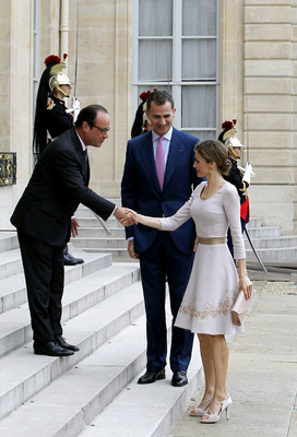 4. Saluda a Hollande y da un paso atrás, como si fuese a esconderse tras Felipe. El Rey, con la mano en la espalda, como a una niña pequeña o a un anciano, tiene que animarla a subir y salvar el desnivel del escalón.