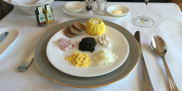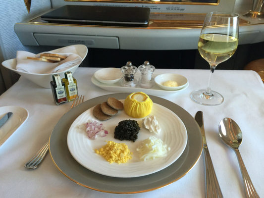 Hablando de vino, ¿por qué empezar con la comida y emparejar el vino cuando se puede hacer al revés? Emirates presentó las cosechas de Dom Perignon con un menú de emparejamiento de canapés que incluía pato curado con melocotón escalfado azafrán y salmón ahumado salvaje, queso crema de limón y comino en pan de Norlander.