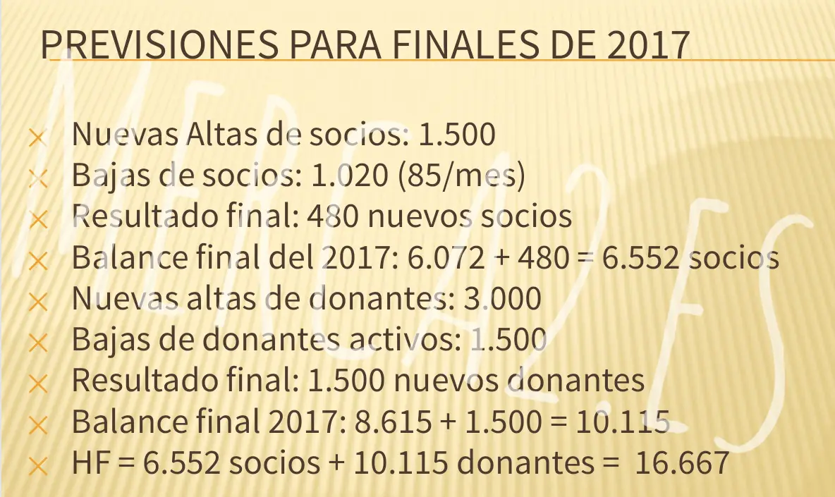 ¿El objetivo para 2017? Amén de subir las cuotas a partir del mes de mayo, el objetivo es alcanzar 3.000 nuevos donantes y un millar de nuevos socios, para lo que prevé un plan de crecimiento mensual a través de televenta y correo postal.