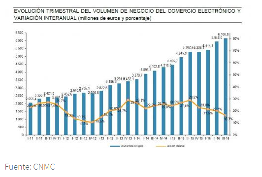 La realidad es que el comercio electrónico sigue con una tendencia claramente ascendente en nuestro país. De hecho, superó los 6.100 millones de euros en el tercer trimestre de 2016, lo que supuso un crecimiento del 16,3% en su tasa interanual.