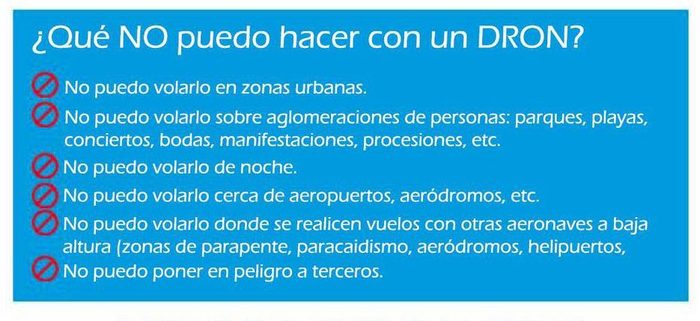 Y es que, en nuestro país no se permite sobrevolar zonas urbanas, o aquellas en las que se produzca una aglomeración de gente, como grandes eventos o parques. Tampoco se pueden usar por la noche, o en zonas -como es lógico- de espacio aéreo restringido -bases militares-.