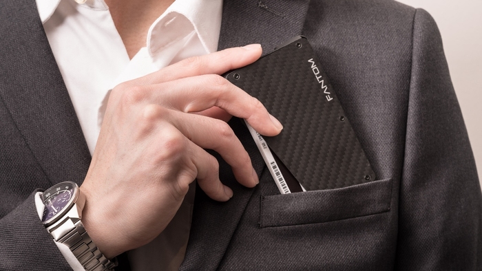 El tarjetero admite el pago contactless, por lo que no es necesario extraer la tarjeta del todo para pagar. También cuenta con inhibidor de copiado de datos. Fantom apenas ocupa 8 mm de largo. «Es la cartera más delgada jamás hecha», aseguran desde la empresa. Y también es la más ligera. Su diseño en fibra de carbono pesa 23 gramos y en aluminio anodizado, 40g.