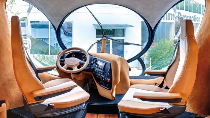 La autocaravana más cara del mundo se parece realmente a algo futurista. Los accesorios en el interior son similares a los que se encuentran en un hotel de lujo, como el corte a mano de los pisos de madera, encimeras de mármol, e incluso una escalera que lleva a la cubierta superior del vehículo.