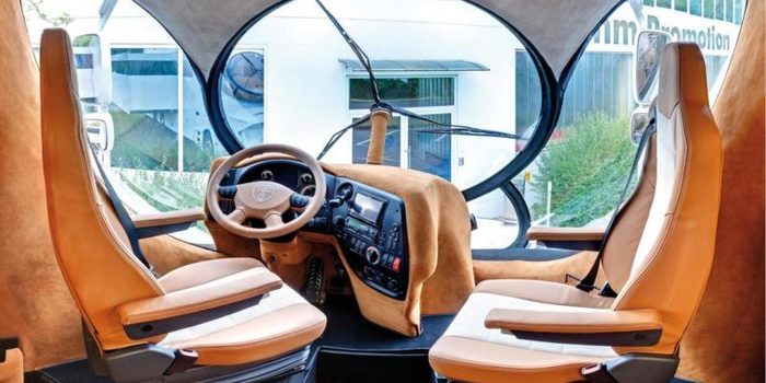 La autocaravana más cara del mundo se parece realmente a algo futurista. Los accesorios en el interior son similares a los que se encuentran en un hotel de lujo, como el corte a mano de los pisos de madera, encimeras de mármol, e incluso una escalera que lleva a la cubierta superior del vehículo.