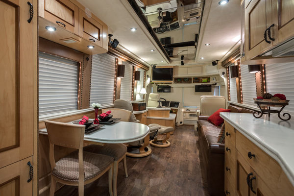 Este motorhome, como muchos de los otros en esta lista, viene equipado con suelo de baldosas de porcelana, armarios y paredes forradas de cedro, un sistema de entretenimiento y hermosa habitación principal forrada con cuarzo y un walk-in closet y cuarto de baño separado.