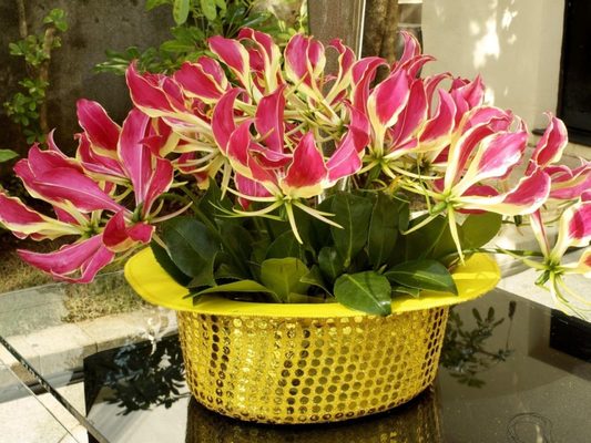Nativa de Sudáfrica y Asia, la Gloriosa es muy cara por ser rara, así como ser única. Con largos zarcillos que soportan el peso de la floración, así como hojas que miden hasta 3 metros, la Gloriosa es conocida por sus vistosas flores, flores rojas o anaranjadas, distintivas debido a sus pétalos pronunciadamente reflejantes.