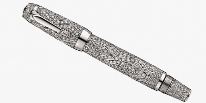 En primer lugar, el cuerpo de la pluma y la tapa están hechos de oro blanco de 18 quilates. Luego, tiene encrustados alrededor de 1.500 diamantes a lo largo de los patrones bohemios. Y el logotipo de Montblanc no es menos exclusivo. Está construido con anillos de oro blanco de 18 quilates y 18 diamantes incrustados.