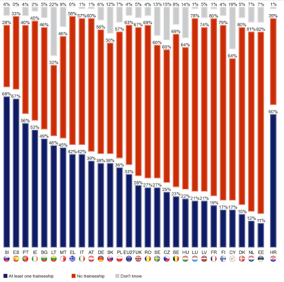 Para tratar de dar respuesta a esta pregunta tomaremos como referencia el informe “La experiencia de los becarios en la Unión Europea”, elaborado por la Comisión Europea. Uno de los grandes datos que arroja el estudio es que España es el segundo país de la Unión Europea con mayor porcentaje de personas tituladas que han hecho prácticas al finalizar sus estudios (67%), únicamente superado por Eslovenia y una cifra dos veces superior a la de la media europea (33%).