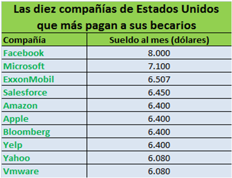 El ranking está liderado por Facebook, que paga 8.000 dólares al mes a sus becarios. La compañía señala que su cultura abierta, junto a mentores de clase mundial y oportunidades de impacto real serían algunas de las razones por las que los estudiantes eligen su programa de prácticas. Además, los becarios que han trabajado en dicha compañía destacan los beneficios que brinda dicha oportunidad (comida gratis, transporte, alojamiento…).