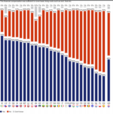 Pero los datos que arrojan el pesimismo vienen a continuación. El estudio muestra como sólo el 42% de las personas en prácticas cobra un sueldo, por lo que más de la mitad (58%) no percibe un sólo euro en su etapa formativa a pesar de cubrir (en muchos casos) el trabajo que realiza un empleado durante sus vacaciones. Si ese dato le resulta llamativo el siguiente tampoco está carente de sorpresa: sólo el 29% de los becarios que recibieron remuneración pudo cubrir sus necesidades básicas, como son la comida y vivienda con dicho sueldo. Una situación que pone de manifiesto que España es el país europeo donde menos becarios reciben un “salario suficiente” para subsistir por ellos mismos, como muestra el gráfico inferior.
