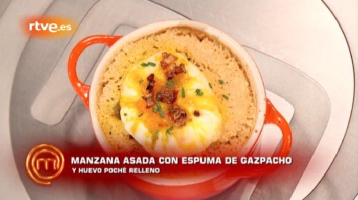 La última «obra de arte» de Masterchef. La prueba consistia en preparar un plato digno de una estrella Michelin ajustándole a un presupuesto de diez euros. Paloma tuvo la idea de presentar una cazuelita con una manzana asada con espuma de gazpacho y huevo poché relleno.