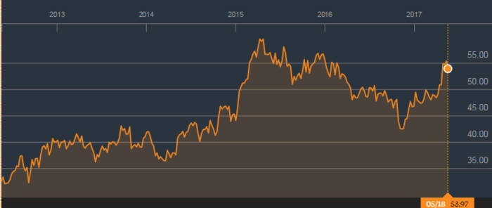 Un buen comportamiento de los resultados que también se traslada al parqué bursátil puesto que la compañía ha emprendido un rally alcista desde mediados de noviembre y que le ha llevado a situarse en máximos de casi doce meses y cerca de sus máximos históricos gracias a un avance próximo al 15% durante este 2017.