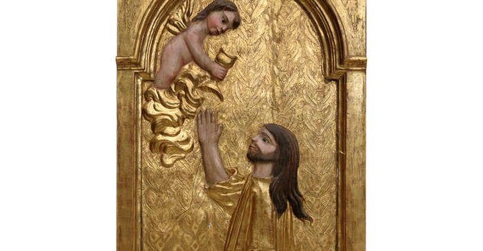 En este artefacto, Jesús está arrodillado ante un acanto trenzado de oro mirando hacia un ángel desnudo descansando sobre una nube y ofreciéndole el cáliz. Este artefacto puede no tener conexión directa con Cristo o la Virgen María. Pero definitivamente es una obra maestra.
