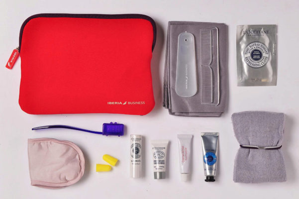 Iberia regala a todos sus pasajeros un único estuche de neopreno rojo, acorde al color que también viste la marca y que incluye varios productos de la firma francesa de cosmética L’Occitane en Provence, como una toallita desmaquillante, un sérum, una crema de manos y un bálsamo labial, además de otros complementos como gomas de pelo, calcetines o una funda para guardar el calzado.