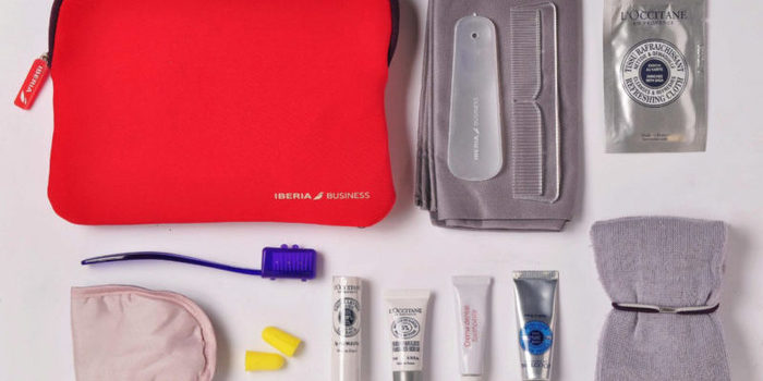 Iberia regala a todos sus pasajeros un único estuche de neopreno rojo, acorde al color que también viste la marca y que incluye varios productos de la firma francesa de cosmética L’Occitane en Provence, como una toallita desmaquillante, un sérum, una crema de manos y un bálsamo labial, además de otros complementos como gomas de pelo, calcetines o una funda para guardar el calzado.